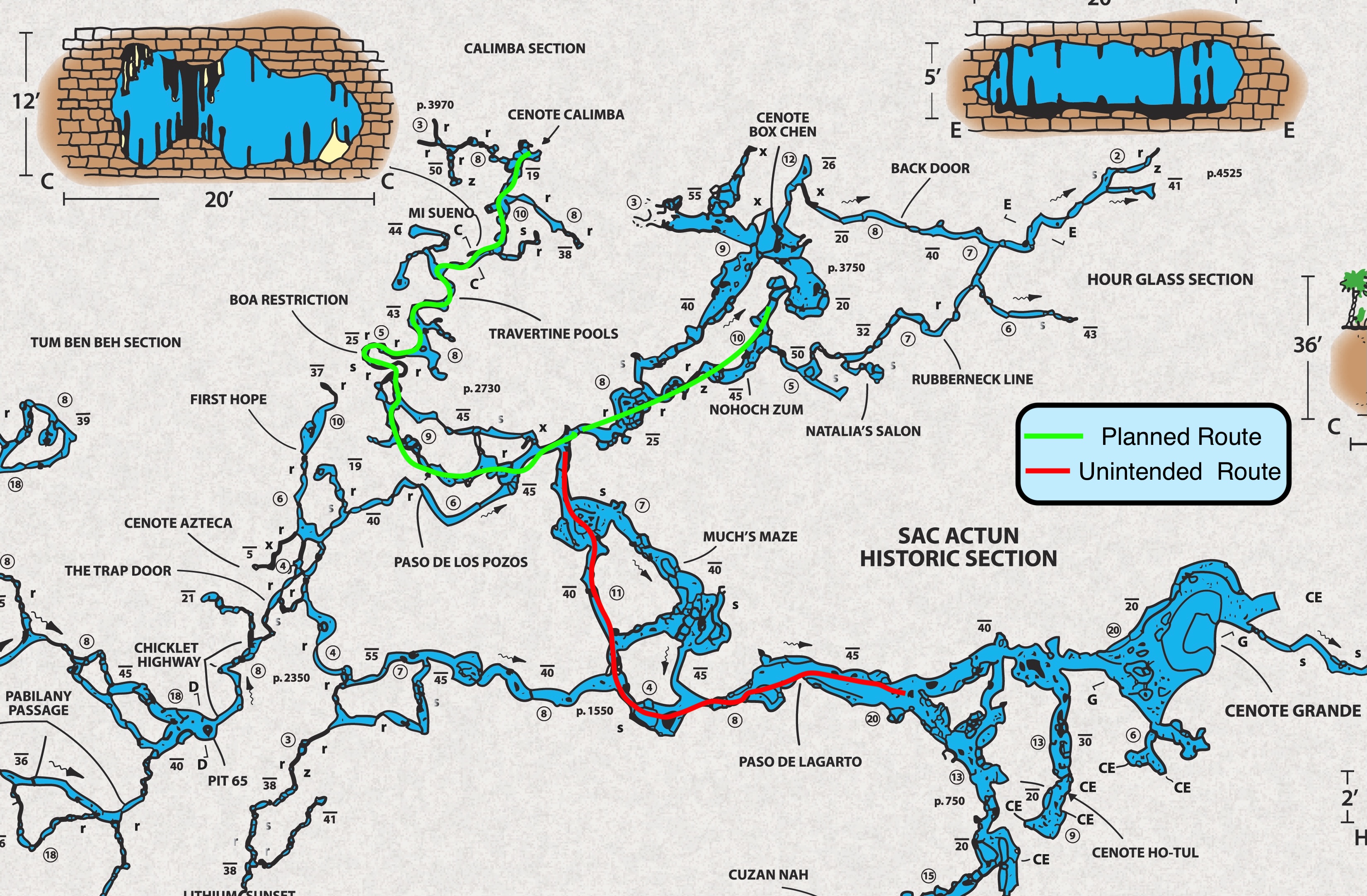 Team 1 entered the cave first, followed later by Team 2. The four divers of Team 2 turned the dive as planned on the Box Chen line. When they got back to the jump from the Box Chen line (to Paso de Lagarto), they removed the marker on the jump line. The Team 2 survivors reported seeing the non-directional marker cookie indicating the direction home towards Calimba via the Snap and Gap, but could not explain why they headed in the opposite direction instead, away from their exit. Survivor 1 was taking photos throughout as the team swam another 500m/1400ft, passing at least four opposing arrows. When they reached the end of the line, Casualty 1 deployed their safety spool in an attempt to connect to the Grand Cenote line, which was 20m/65ft away, and Survivor 1 followed. However at this point Casualty 2 headed back towards Calimba, followed by Survivor 2. Survivor 1 also turned round and headed back, so Casualty 1 recovered their spool and followed the other three divers back to Calimba.