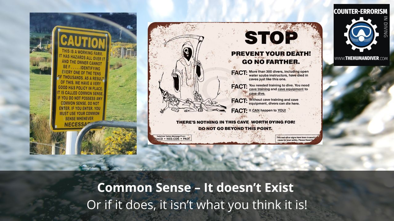 How often have you heard the phrase, normally after something ‘obvious’ has gone wrong, “They should have used their common sense” or “Has common sense died out?” To you (or those observing the outcome) it was obvious that the situation would develop in the manner it did. This is partly because of the hindsight bias, but also has to do with how we make decisions or choices when faced with uncertainty i.e., no guarantee of a particular outcome (especially the one we want!). One of the reasons that the Grim Reaper sign is placed in caves is because it appears to be common sense not to enter caves without training or the right equipment, but there are still divers who do this without recognising the risks they face if something were to go wrong.