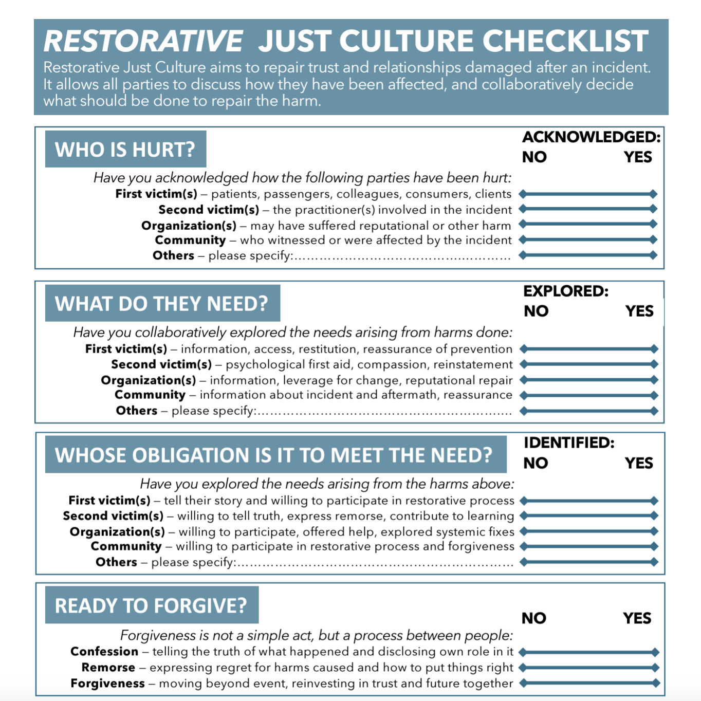 A just culture also recognises the emotional toll of incidents. Traumatic events—like a diver’s rapid ascent or a near-drowning—can leave lasting effects on all involved. Good organisations include post-incident support, counseling, or at least some system to ensure that the divers (and instructors) aren’t left to process guilt and sorrow on their own. In the non-diving space, the Restorative Just Culture checklist is a great place to start for identifying who has been harmed, what do they need, and whose obligation is it to address that need. In the diving space, Dr Laura Walton, provides amazing resources and support via www.fittodive.org